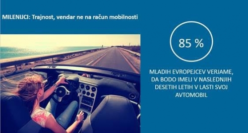 Dobra večina slovenskih predstavnikov milenijske generacije (62,1 %) je prepričana, da bi morala biti v središču trajnostnih prizadevanj avtomobilske industrije in transportnega sistema v letu 2025 vozila z učinkovito porabo goriva. Na drugem mestu se je znašlo vlaganje v sistem javnega prevoza (40,6 %), na tretjem pa reciklaža že uporabljenih delov (37,9 %). Milenijska generacija pri nas tako pričakuje splošne izboljšave transportnega sistema, vendar ne na račun omejevanja svobode izbire prevoznih sredstev in gibanja. Kar 91,5 % mladih namreč verjame, da bodo imeli v naslednjih desetih letih v lasti svoj avtomobil, medtem ko je povprečje med vsemi evropskimi študenti obstalo na 85 %.
