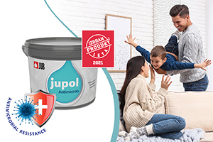 Kakovost bivanja in zdrav bivanjski prostor, v katerem je naše dobro počutje na prvem mestu, je za vsakega od nas izjemnega pomena. V notranjih prostorih poleg kakovosti zraka na naše bivalno udobje zagotovo vplivajo tudi barve, s katerimi osvežujemo zidne površine. V skrbi za uporabnike in kot odgovor na aktualno zdravstveno krizo s Covid-19 smo v JUB-u razvili aktivno notranjo barvo JUPOL Antimicrob, ki na stenskih površinah učinkovito preprečuje hitro razmnoževanje virusov z ovojnico, bakterij in plesni. JUPOL Antimicrob v 24 urah zmanjša koncentracijo mikroorganizmov do 99,9 %, kar potrjujejo rezultati testiranj s strani mednarodno priznanega laboratorija za mikrobiološke analize J.S. Hamilton. Naša najnovejša antimikrobna notranja zidna barva, testirana po ISO standardih, je tudi letošnja dobitnica pečata Izbran produkt leta 2021.
