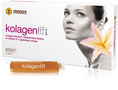 Kolagenlift je kombinacija patentirane oblike kolagena VERISOL, ki zmanjšuje gubice ter izboljšuje elastičnost in napetost kože, hialuronske kisline, ki sodeluje pri dovajanju hranilnih snovi celicam in odvajanju odpadnih snovi, in vitamina C, ki ima vlogo pri nastajanju kolagena. Sestavine so raztopljene v agavinem sirupu in priročne za uživanje. Učinki so opazni v 4. tednih.