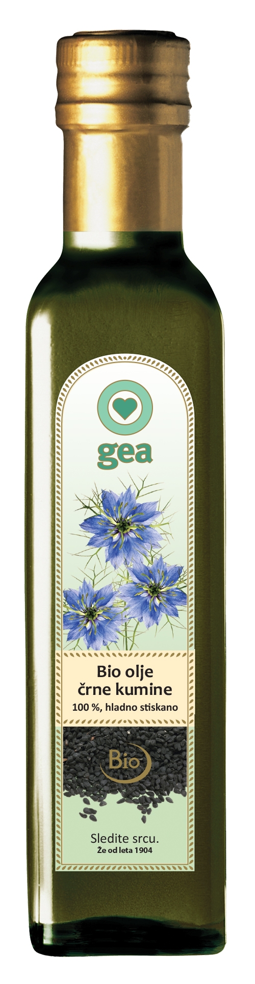 Gea olje črne kumine pridobivamo s hladnim stiskanjem semen iz ekološke pridelave. Semena vsebujejo od 25-28 % olja, tako da za 1 l olja črne kumine potrebujemo 5-6 kg semen.