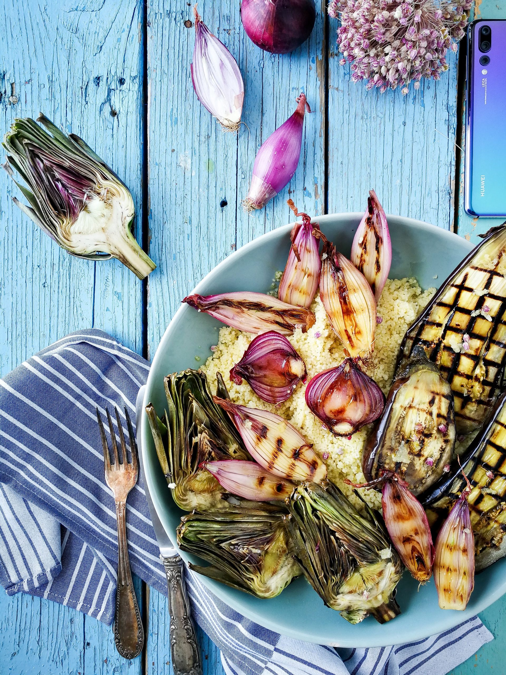 Vodo zavremo, solimo, dodamo žlico olivnega olja, kus kus in odstavimo. Pokrijemo s pokrovko in počakamo 5 minut, da se kus kus poduši. Nato vmešamo maslo in ga z vilico razdrobimo. Jajčevce, šalotko in artičoke popečemo na olivnem olju v ponvi ali v pečici. Po pečenih jajčevcih stremo česen z malo olivnega olja. Sledi samo še njam, njam.